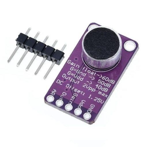Ce module équipé d’un microphone à électret est amplifié par un MAX9814 avec un gain maximum de 40 dB, 50 dB ou 60 dB avec un contrôle automatique du gain.